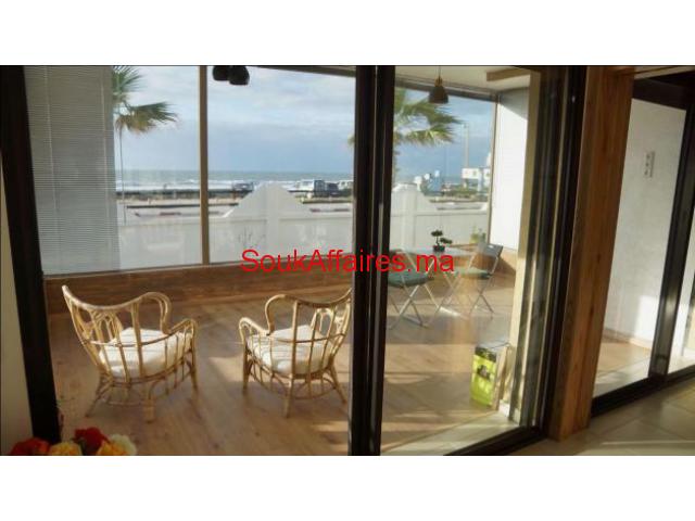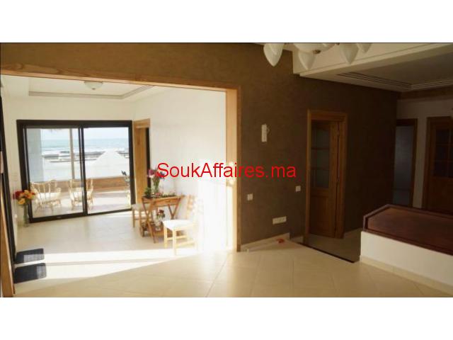 Bel appartement meublé avec vue Mer dans une résidence fermée avec piscine à El Mansouria, Résidence Océan bleu, 40km de Casablanca , et 9km de Mohammedia à deux pas de plage mimosa. Vue sur mer sans vis à vis Surface totale : 108 m carrée couverte plus une terrasse de 40m carrée 2 chambres, double salon, terrasse avec baie vitrée, cuisine, 2 salles de bain, douche à l’italienne. Chambre 2 : 2,70 m* 4,10m Chambre 1 : 2,90m* 3,80m Salon 1 : 3,60m * 3,90m Hall : 3m * 3,70m Terrasse couverte avec baie vitrée : 3,30m * 5,50m Terrasse : 40 m carré Ameublement Neuf. Tel : 0614616620