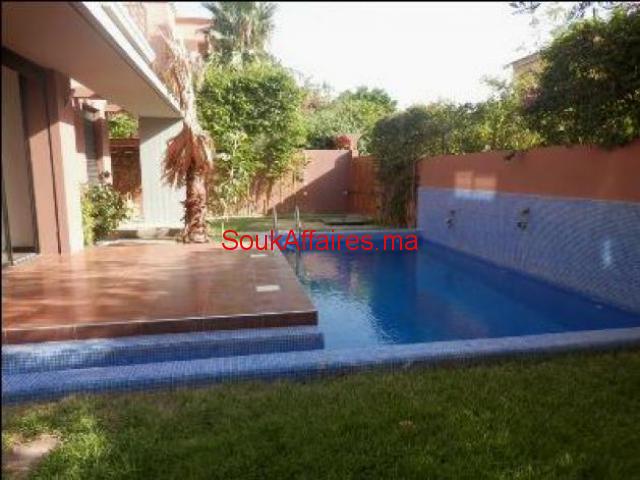 belle villa de deux façades à louer meublée avec un beau jardin dont une belle piscine et garage pour 3 voitures. villa de charme composée de: rez-de-chaussée: 1 salon marocain; 1 salon avec cheminée avec accès terrasse et piscine; un salon européen; un coin repas ; une grande cuisine entièrement équipée et aménagée.une chambre; une toilette/lave-mains invités. à l'étage: 1 chambre avec son dressing et sa salle de douche; 2 chambres avec une salle de bain commune et balcons; une suite parentale avec cheminée, un grand dressing; une belle salle de bain dont baignoire et douche. une grande terrasse avec hammam beldi réf:2229 Tel : 0669688611