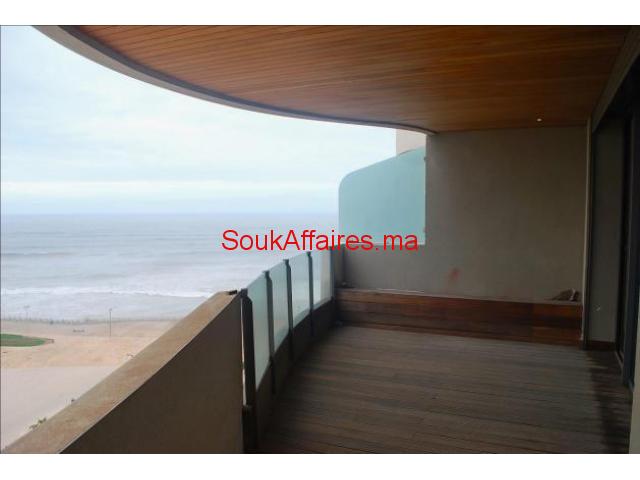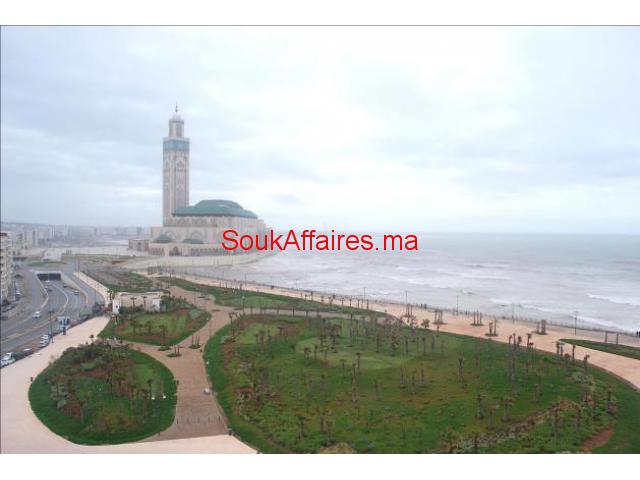 Superbe appartement neuf, de 135m situé dans la résidence Marina sur la corniche de Casablanca. Vue directe sur l'océan. Très ensoleillée sans vis a vis avec terrasse, vu sur la mer et la mosquée Hassan 2. N.B: Pour une longue durée. Il comprend Salon ouvert sur une belle terrasse plein sud, 2 chambres avec salle de bain privative, balcon et dressing, Cuisine ultra moderne aménagée, Buanderie, Salle d'eau invités. Climatisation centralisée réversible / Domotique 1 place de parking au sous-sol. Tel : 0614616620