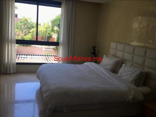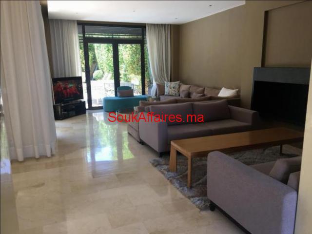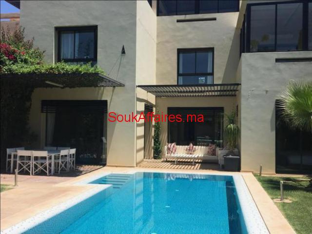L'agence ARTIMMO, vous propose en location longue durée, dans un domaine fermé et sécurisé 24h sur 24, une belle villa à la décoration moderne avec beaucoup de goût et en excellent état. Construite sur 500 m2 habitable en plain pied, composée: - Un Salon européen spacieux avec cheminée ouvert sur jardin et la piscine; - Un salon-Télé - 2 cuisines moderne entièrement équipée avec un plan de travail et plein de rangements. - et des toilettes visiteurs; - deux belles chambres toutes avec salles de bains et dressing donnant sur le jardin; - Une suite parentale avec sdb et dressing, un grand dressing, un petit-salon; Une superbe terrasse bien aménagée avec espace pergola, bar d'été, barbecue...offrant une vue à 360° sur les beaux espaces verts de la résidence et sur l'Atlas. Une buanderie et une chambre pour le personnel avec Toilettes. Toutes les pièces sont climatisés (réversibles) Le tout complété par une piscine chauffée et un vaste jardin . Plusieurs espaces de rangements ont été aménagés dans la villa. Garage. Le domaine Al Maaden est très bien gérée par un syndic professionnel, offre en plus du Golf, terrain de tennis, de ces beaux espaces verts et des espaces jeux pour les enfants et une grande piscine collective. Proximité des golfs (Royal,et Amelkis); centre ville est à 10mn. Le loyer est de 42.000 DH/ mois charges de co-propriété Comprises. réf:3101 Tel : 0669688611