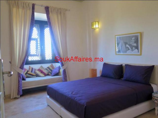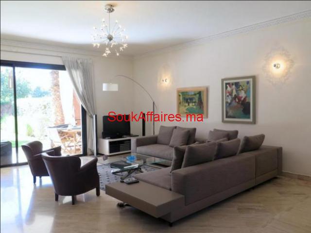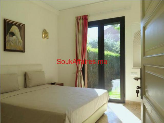 Situé à 5 min du centre de Marrakech et 3mn de l’aéroport, cette villa raffinée réalisée par le groupe Hermes, avec une belle fusion entre les l'architecture moderne et marocaine, offrant un très grand confort : Elle se compose de: - 4 chambres (une au RDC et 3 à l'étage) toutes avec sdb privative dont une suite parentale avec grande terrasse; - un grand séjour avec cheminée - coin salon- et coin salle à manger, tous ouverts sur 2 jardins; une cuisine équipée, Un joli jardin privatif Une terrasse offrant une vue à couper le souffle sur l'Atlas et le golf. Une loge pour le personnel de maison avec sdb. Le domaine propose de nombreuses activités : terrain de tennis, espace nautique, tennis, salle de sport, salle de yoga ... et des beaux jardins verdoyants. Il Entièrement sécurisé et très bien fréquenté. Ref. : 1874 Tel : 0669688611