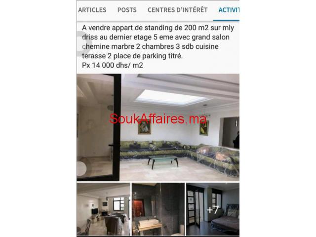 BEL Appartement de standing de 200m2 sur mly driss au dernier étage 5ème avec grand salon chemine marbre 2 chambres 3 sdb cuisine terrasse 2 place de parking titré. Px 14 000 dhs/ m2 Pour plus d'info n'hésitez pas a nous contacter Tel : 0696832232