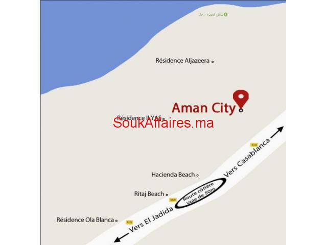 RESIDENCE AMAN CITY SIDI RAHAL Aman city vous offre un programme pensé pour votre confort dans un luxe raffiné telle que SIDI RAHAL et aussi dans des lieux uniques jouissants d'un environnement exceptionnel. Des appartements F1 et F2 de 50M jusqu'à 118M avec des terrasses (moitie prix) Finition moyen standing avec piscine et terrain de tennis Projet se situe a 400m de la plage juste a cote OLA BLANCA Projet finance par CIH bank Tel : 0661195066