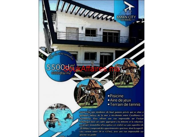 Projet AMAN CITY Beach une excellente situation, D'un emplacement stratégique, à proximité immédiate de la zone SIDI RAHAL, la residence balneaire AMAN CITY Beach vous offre un cadre agréable, des installations de proximité et espaces verts avec piscine répondant à vos exigences et vous assure, ainsi qu'à votre famille, plus de tranquillité et de stabilité. Le projet AMAN CITY Beach vous propose des appartements de conception moderne et des finitions de qualité. • Situation : Sidi rahal, Près de OLA BLANCA • Superficies : 50 à 118 m² • Contenance : salon,1 ou 2 pièces, SDB, hall, Balcons et cuisine. • Prix : 5500 dhs/m² • Équipements : espaces verts, espaces jeux, piscine... Pour plus de détails, n'hésitez pas à nous contacter Tel : 0661195066