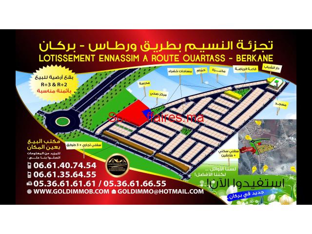 LOTISSEMENT NASSIM A BERKANE HAY OUARTASS vous propose des Lots de terrainn constructible R+2 et R+3 Allant de 90 m2 à 280 m2 proche de toutes commodités à savoir: MOSQUEE, ECOLE, STATION BUS , CENTER DE SANTE, HAMMAM, PATISSERIE, SALLE DE SPORT, MAISON DES JEUNES,, LE PRIX A PARTIR DE 2700 DH M² Tel : 0661050047