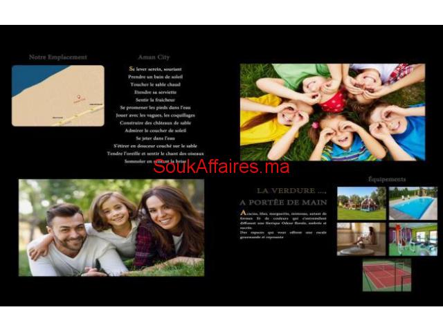 RESIDENCE AMAN CITY SIDI RAHAL plus que jamais, résidence AMAN CITY SIDI RAHAL est engagé dans une approche où tous nos processus sont conditionnés par l’objectif de la satisfaction de nos clients. Des appartements F1 et F2 de 50M jusqu'à 118M avec des terrasses (moitie prix) Finition moyen standing avec piscine et terrain de tennis Projet se situe a 400m de la plage juste a cote OLA BLANCA Projet finance par CIH bank Tel : 0661195066