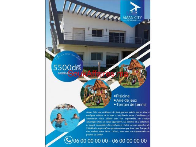 RESIDENCE AMAN CITY SIDI RAHAL Proposer des biens immobiliers luxueux, adaptés et originaux, sur des sites uniques dotés d’équipements intégrés avec un rapport qualité/prix inégalé. Telle est la mission de AMAN CITY, notre marque d'immobilier de prestige. Des appartements F1 et F2 de 50M jusqu'à 118M avec des terrasses (moitie prix) Finition moyen standing avec piscine et terrain de tennis Projet se situe a 400m de la plage juste a cote OLA BLANCA Projet finance par CIH bank Tel : 0661195066