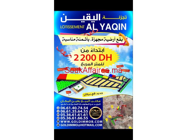 LOTISSEMENT AL YAQIN A BERKANE vous propose des Lots de terrain constructible R+2 Allant de 90 m2 à 160 m2 proche de toutes commodités à savoir: LYCEE, adressKHAIBAR BERKANE MOSQUEE, ECOLE, , SANTE PUBLIC, MAISON DES JEUNES, LE PRIX A PARTIR DE 2200 DH M² merci de nous contacter pour plus d'informations ville-Berkane Tel : 0661050047