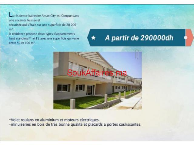 RESIDENCE AMAN CITY SIDI RAHAL Proposer des biens immobiliers luxueux, adaptés et originaux, sur des sites uniques dotés d’équipements intégrés avec un rapport qualité/prix inégalé. Telle est la mission de AMAN CITY, notre marque d'immobilier de prestige. Des appartements F1 et F2 de 50M jusqu'à 118M avec des terrasses (moitie prix) Finition moyen standing avec piscine et terrain de tennis Projet se situe a 400m de la plage juste a cote OLA BLANCA Projet finance par CIH bank Tel : 0661195066